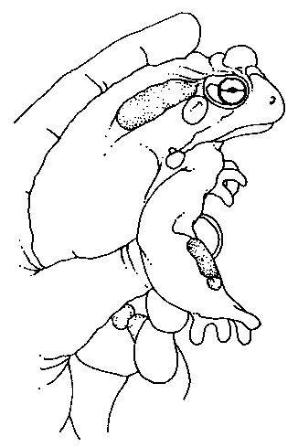 When you are ready to begin, hold the toad firmly with one hand and, with thumb and forefinger of your other hand, squeeze near the base of the gland until the venom squirts out of the pores and onto the glass plate. Use this method to systematically collect the venom from each of the toad's granular glands: those on the forearm, those on the tibia and femur of the hind leg and, of course, the parotoids on the neck. Each gland can be squeezed a second time for an additional yield of venom if you allow the toad a one hour rest period. After this, the glands are empty and require four to six weeks for regeneration.The venom is viscous and milky-white in color when first squeezed from the glands. It begins drying within minutes and acquires the color and texture of rubber cement. Scrape the venom from the glass plate, dry it thoroughly, and store it in an airtight container until you are ready to smoke it.