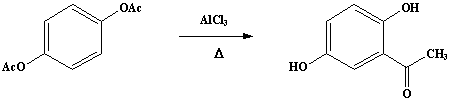 A mixture of 50g (0.257 mole) of dry hydroquinone diacetate and 116g (0.87 mole) (Note 1) of anhydrous aluminum chloride is finely powdered in a mortar and introduced into a dry 500-mL RB flask fitted with an air condenser protected by a calcium chloride tube and connected to a gas-absorption trap. The flask is placed in an oil bath (Note 2) which is heated slowly from room temperature so that at the end of about 30 minutes the temperature of the oil reaches 110-120°C, at which point the evolution of hydrogen chloride begins. The temperature is then raised slowly to 160-165°C and maintained at that point for about 3 hours (Note 3); at the end of about 2 hours the evolution of hydrogen chloride becomes very slow and the mass assumes a green color and becomes pasty in consistency (Note 4).