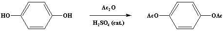 One drop of concentrated sulfuric acid is added to a mixture of 110 g. (1.0 mole) of hydroquinone and 206 g. (190.3 ml., 2.02 moles) of acetic anhydride (Note 1) in a 1 L Erlenmeyer flask. The mixture is stirred gently by hand; it warms up very rapidly, and the hydroquinone dissolves. After 5 minutes the clear solution is poured onto about 800 ml. of crushed ice. The white crystalline solid which separates is collected on a Buchner filter and washed with 1 L of water. The filter cake is pressed occasionally to facilitate the removal of water; the solid is dried to constant weight over phosphorus pentoxide in a vacuum desiccator. The nearly pure product weighs 186-190 g. (96-98%) and melts at 121-122°C (Note 2); it can be recrystallized from dilute ethanol (Note 3).