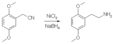 Place 24 g (0.136 mol)of 2,5-dimethoxybenzylcyanide in flask, add 300 ml of 96% ethanol, and then 15 g of anhydrous NiCl2 (or 20 g dihydrate). Under magnetic stirring add 38 g (1 mol) of NaBH4 in small portions during 30-40 min. Immediately black color appears. Temp. during the addition rose to 40-50°C, and evolution of H2 observed. When addition of borohydride complete, stir another 3 hrs at 40-50°C, and after cooling 200 ml of 3N HCl added into the reaction mixture and that stirred till the black precipitate dissolved. After removal of ethanol under vacuo and extracting of unreacted nitrile with ether or hexane, the aqueous layer made alkaline with conc ammonia soln and then extracted with ether 3 times. Combined extracts washed with brine, dried over MgSO4 and evaporated. Obtained oil (2C-H) (19g, 73% yield) used as such for bromination. Unreacted cyanide can be isolated from the etheral washes of the reaction mixture and reduced once more, this will improve conversion of the benzyl cyanide to the phenethylamine to near 90-95%. |