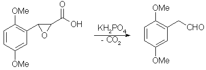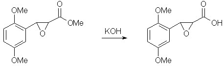 0.12 moles of sodium methoxide as a 15% solution in methanol (made by cautiously dissolving 2.75 g small pieces of sodium metal in 50ml of MeOH) is added with stirring during one hour to a solution of 0.1 mole of 2,5-dimethoxybenzaldehyde (16.6g) in 0.14 moles of methyl chloroacetate (10.9g) while keeping the temperature between 15-20°C. After the addition is finished, the stirring is continued at room temperature for one more hour. 2,5-Dimethoxyphenylglycidic acid