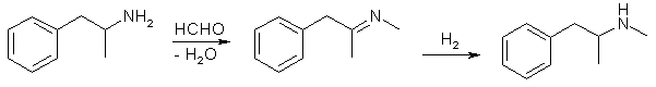 To avoid this happening, we must usually resort to indirect methods of introducing the methyl group. One way is to react the amphetamine with formaldehyde (either as an aqueous solution, or as paraformaldehyde) to get the amphetamine formaldehyde imine, which can then be reduced to the N-methylamphetamine using a several different reducing agents, for example Al/Hg or Pt/H2.