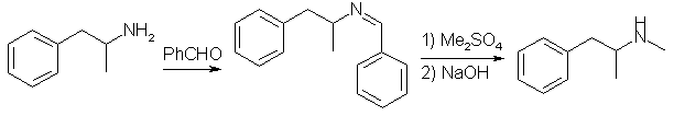 Another way is to react the amine with benzaldehyde to form an imine, which then can safely be alkylated with methyl iodide or dimethyl sulfate, and after hydrolysis of the resulting compound, N-Methylamphetamine is formed.