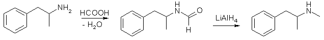 There are many procedures out there for the production of N-methyl-amphetamines (methamphetamines) from various starting materials, such as phenyl-2-propanone (P2P) or ephedrine, but what if you already have an amphetamine (or phenethylamine) and wanted to add a methyl group to the nitrogen atom? If you would use the first reaction that comes to mind for the conversion, to alkylate the amphetamine with methyl iodide or dimethylsulfate, you would be disappointed, as you would get a mixture of products, most important the N,N-dimethyl-amphetamine (of very low activity), as once the amphetamine has been methylated to methamphetamine, the molecule is much more succeptible to another alkylation, and thus the dimethyl- amphetamine is formed much faster than the remaining amphetamine is alkylated to methamphetamine. Actually, in the reaction mix you would find unreacted amphetamine, N-methylamphetamine, N,N-dimethyl- amphetamine and even some of a quaternary N,N,N-trimethylamphetammonium salt.
