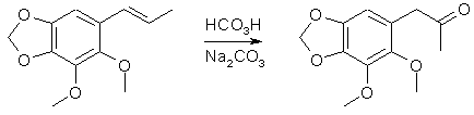 500mls of dillapiole [1] was refluxed with 10g of 85% KOH under medium vacuum for 11 hours, then transferred to a vacuum distillation rig and 450ml of iso-dillapiole was recovered at bp 145-146°C/6mmHg, it was recrystallized from an equivalent volume of boiling petroleum ether, yeilding 410g of clear 1-2 cm long prisms with a mp of 38°C [2]. 2,3-Dimethoxy-4,5-Methylenedioxy-Phenyl-2-Propanone