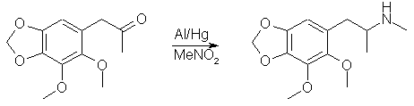14g of Al (Heavy duty Reynolds) was amalgamated in 400mls MeOH and 50mg Hg2Cl2 by heating to reflux. The flask was fitted with a reflux condenser and was then transferred to a cold stirrer, 18.3g ketone and 13.7g MeNO2 in 50mls MeOH were then added dropwise over 15 minutes [5]. The rxn was allopwed to stir overnight. 500mls 50% NaOH was slowly added, then extracted with 400mls toluene followed by a 150ml extraction. Pooled extracts, and washed twice with H2O and once with brine, dried through MgSO4, and gassed yeilding 15.5g of DMMDMA-2 [6] with a melting point of 147-148°C [2]. Oxime of 2,3-Dimethoxy-4,5-Methylenedioxy-Phenyl-2-Propanone