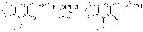 195g NaOAc.3H2O was dissolved in 140mls dH2O with stirring, followed by addition of 725mls MeOH, 230g of the phenylacetone and 83g NH2OH.HCl, the stirred suspension was heated to reflux for 1.5hrs on water bath then 350mls of cold dH2O was slowly poured down the condenser and rxn was allowed to cool to RT with vigourous stirring and then refrigerated and the precipitate vac filtered after 2-3 hours. The mass of the crude oxime was greater than the input of precursor ketone. Recrystallization of 55g crude from 100mls IPA yeilded 20g of white needles with a mp of 107-108°C [2,7]. 2,3-Dimethoxy-4,5-Methylenedioxy-Amphetamine HCl (DMMDA-2) [8]