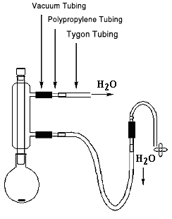 To assemble this handy tool, cut a length of standard Tygon tubing (or red rubber tubing, if desired) that provides a useful range of reach within the fume hood. Into both ends of the Tygon tubing, insert four-inch lengths of white polypropylene tubing. Note: the use of THF or chloroform is often useful to swell the Tygon tubing, making the stretch over the hard tubing easier. Glycerol is also helpful for this maneuver. On the extended ends of both pieces of the polypropylene tubing, stretch three-inch pieces of black rubber vacuum tubing to complete the assembly. Connect one end to the water spigot, and the other end to the reflux condenser. Fashion a second unit to lead the flow from the condenser top to the sink (or to a second condenser in a parallel fashion).