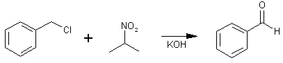 To test the feasibility of using water without alcohol, a suspension of benzyl chloride was heated and stirred in an aqueous solution of potassium 2-propanenitronate, giving a 49% yield of benzaldehyde. The possibility that the aqueous conditions might operate against a carbon-alkylation side-reaction had to be discarded when para-nitrobenzyl chloride was treated with an aqueous solution of sodium 2-propanenitronate and found to give a 59% yield of the carbon-alkylation product, 2-methyl 2-nitro-1-(para-nitrophenyl)-propane, and no para-nitrobenzaldehyde.