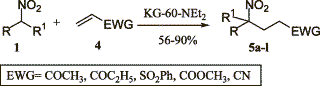 Synthetic results of conjugate addition of nitroalkanes to electron-poor olefins are reported in Table 2. A wide range of nitroalkanes and electron poor olefins underwent Michael addition by this procedure affording products 5 (Scheme 2) in good to excellent yield.