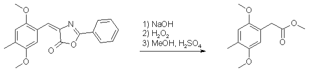A solution of 4-(2,5-Dimethoxy-4-methylbenzylidene)-2-phenyl-2-oxazolidin-5-one (15.0g) in 100ml 10% NaOH solution was heated under reflux for 12h. The reaction mixture was cooled to 0°C and diluted with 10ml ice-cold 40% NaOH solution. To this solution was added with stirring, a 15% aqueous solution of hydrogen peroxide at such a rate to maintain the temperature below 15°C. After this addition was complete, the solution was left at room temperature for 12h, then acidified with 50ml concentrated HCl and extracted thorougly with benzene [or other non-polar solvent]. The organic extracts was dried over MgSO4, filtered, and evaporated to give a solid (15.5g) which was dissolved in 100ml methanol containing 2ml H2SO4. This solution was heated under reflux for 5h, concentrated and cooled in the fridge, whereupon 9.2g of the title ester precipitated, with a mp of 66-67°C after recrystallization from ethanol 2,5-Dimethoxy-4-methyl-phenylacetic acid [1]