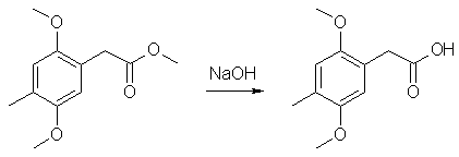 A suspension of 8g methyl 2,5-Dimethoxy-4-methyl-phenylacetate in 50ml 10% NaOH solution was heated under reflux for one hour, cooled and acidified with concentrated HCl. This gave a precipitate of 2,5-Dimethoxy-4-methyl-phenylacetic acid (7.6g), which after recrystallization from ethanol had a mp of 128-129°C 2,5-Dimethoxy-4-methyl-phenyl-2-propanone [1]