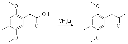 A solution of 2,5-Dimethoxy-4-methyl-phenylacetic acid (9.0g) in 100ml ether was added slowly to 60ml of a 2.1 M solution of methyllithium in ether. The mixture was heated under reflux for one hour and then added to 200ml ice-water saturated with ammonium chloride. The organic layer was collected and the aqueous portion was extracted with 2x100ml ether. Evaporation of the combined oganic phases yielded the ketone, 4.7g (mp 56-58°C). Acidification of the aqueous phase caused the precipitation of the phenylacetic acid (2.1g). Preparation of Methyllithium [2]Methyliodide (425.7 g, 3.00 moles) was added with stirring to 48 g (7.0 moles) of lithium in 2.5 L of ether under nitrogen at a rate adequate to maintain gentle reflux of the ether. After 24 hours the solution of methyllithium was decanted into a storage vessel filled with nitrogen. The concentration was estimated in the usual way by hydrolysis of an aliquot and titration with 0.1N hydrochloric acid. Very pure methyllithium can also be prepared from methyl chloride and lithium powder containing 1% Na [3]. References [1] Can. J. Chem. 52, 395 (1974)
