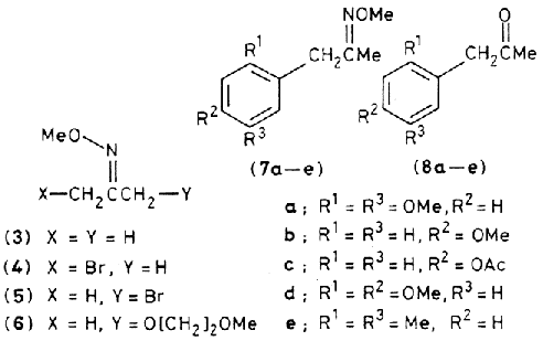 The bromo-oxime ethers (4) and (5) were also converted into a reactive intermediate of type (2) which reacted in aromatic substitution reactions. Addition of 10mmol of either (4) or (5) in 20 ml of dry DCE to a solution of 10 mmol of AgBF4 and 10mmol of the aromatic compound in 20ml of DCE at 25°C followed by efficient stirring in the dark for 18hr and then work-up with a 10% KCN-H2 solution gave good (82-91%) yields of the aromatic substitution products (7a-e) * as the E-isomers. Acid treatment of (7a-e) (HCl-H2O-MeOH 1:5:5) for 10 hrs at 65°C and distillation gave the corresponding arylacetones (8a-e) in high (90%) yield.