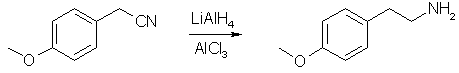A dry flask was charged with ca. 600 ml of anhydrous Et2O and chilled in ice as 80 g (0.6 mole) of anhydrous AlCl3 was added portionwise, followed by 23 g (0.6 mole) of LAH (LAH alone and other metal hydride reagents are unsatisfactory for the reduction of benzylic nitriles to amines) [3]. The dried Et2O solution of crude p-methoxy-phenylacetonitrile was added at such a rate as to maintain gentle reflux without external heat (ca. 1 hr). The mixt was stirred for 2 hr, then chilled in ice, and treated dropwise with 25 ml of H2O followed by 250 ml of 20% of aq NaOH, with periodic addition of Et2O through the condenser to replenish losses and facilitate stirring. The resulting voluminous, granular ppt of NaCl and LiCl and aluminate was removed by filtration, washed well with Et2O and discarded. The filtrate was mixed with one-third its vol of abs EtOH and 60 ml of concd HCl was added slowly with continuous swirling and ice cooling. After chilling to 0°C, the crystalline amine hydrochloride was collected, 101 g, mp 212-214°C. The overall yield was 75% from anisyl alcohol. The hydrochloride may be recrystd from Et2O-EtOH or i-PrOH. References [1] Edgar F. Kiefer, J. Med. Chem. 15(2), 214 (1972).