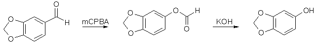 60g Piperonal was dissolved in 500ml DCM, and 90g MCPBA (m-Chloroperoxybenzoic acid) was added in portions, and the mixture stirred for 18h. The precipitate was filtered off and washed with DCM. The combined filtrates was then washed with cold saturated Na2CO3 solution, followed by H2O, dried over MgSO4 and evaporated to dryness. The resulting formate ester was dissolved in 250ml methanol and mixed with a solution of 30g KOH in 200ml methanol. The reaction mixture was stirred at room temp for 15h, evaporated to dryness, the residue dissolvd in 300ml water, neutralized with 6M HCl and extracted with ethyl acetate. The organic layer was washed with NaHCO3 followed by water, dried over MgSO4 and evaporated to dryness. The crude product (57g) was recrystallized from hexane to give colorless crystals of Sesamol (48g), mp 54-55°C. 3,4-Methylenedioxyanisole
