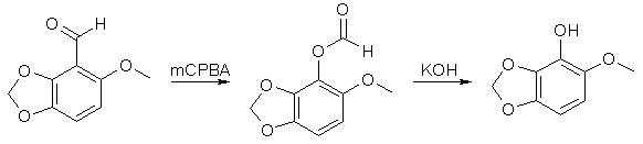 20g 6-Methoxy-2,3-Methylenedioxybenzaldehyde was stirred with 30g MCPBA (m-Chloroperoxybenzoic acid) in 500ml DCM for 18h. The precipitate was filtered off and the filtrate washed with Na2CO3 solution, and evaporated to dryness. The formate ester residue was stirred with 5% methanolic KOH for 2h, and resulted in 12g of a low-melting solid, which after recrystallization from hexane had mp 89-90°C. 1-Allyloxy-6-Methoxy-2,3-Methylenedioxybenzene