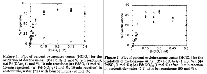In all reactions 0.1 mmol of the Pd(II) salt, 10 mmol of the olefin, 9 mmol of benzoquinone, and varying amounts of HClO4 (72% w/v) in a total volume of 20 mL were used. The reaction time was 10 min. The reaction mixture was then extracted into diethyl ether, washed with 30% (w/v) aqueous NaOH, and finally dried over MgSO4. Products were analyzed by a capillary GC-internal standard method, with both n-tridecane and n-hexadecane used as internal standard.