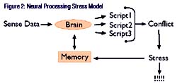 People have stress loops running all the time - I need to pay my bills but I'm broke. I want to spend time with my family but I need to work more. I want to be physically fit but I eat junk food and have no time to exercise. Since there is no specific action or routine to run in the instance of an unresolved stress loop, the brain just drops a stress packet onto the body each time one of these loops is run. A stress packet is kind of like a neurochemical null -- a spurt of wasted processing time that manifests itself as physical tension in the body: a furrowed brow, clenched teeth, headaches, backaches, muscle tightness, high blood pressure, rapid heart beat, etc. As these nulls start dropping on the body we get hung up and stressed out, and because all of these conflicting scripts remain in memory, they just run again and again each time the same set of sense data is presented.