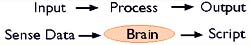 We have sense data coming in, that's our input. This data gets sent to the brain for processing, and once it is processed the brain spits out some kind of script or routine which makes the body perform an action. For example: You're driving down the street minding your own business and someone runs out in front of your car. Snap. In an instant you process that data, decide that smashing into this person is a very bad idea, and proceed to slam on the brakes, swerve, or if you're in New York, lean on your horn and give them the finger.