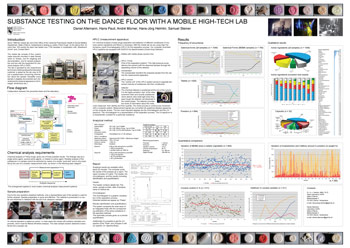 Hans-Jürg Helmlin, head of the mobile lab unit of the Office of the Cantonal Pharmacist, Health & Social Welfare Department, State of Bern, Switzerland, discussed the on-site analysis of street drugs via HPLC-DAD that his group has been doing, in cooperation with Streetwork Zürich and Contact Bern. In Switzerland -- as well as Spain and Vienna -- showing up at parties and doing analytical testing is perceived by the general public as a credible harm reduction approach, acting as a vehicle to effectively deliver counseling. With the multiplicity of substances, providing more specific data about them makes an impression on users. While Austrian law prohibits operators of drug checking equipment to touch samples, this restriction does not exist for Swiss drug checking.As of May 2010, the Swiss lab has run 1710 tests from 115 parties since it first started analyzing in 1998.6 A sample of Helmlin's observations gleaned from analyzing drug samples: when mCPP was causing all-night vomiting, vendors began adding an antiemetic to tablets; there is a large variety in results from capsules; for powder samples, if the number of amphetamine samples submitted for analysis goes up, the number of cocaine samples go down; if a Swiss tablet contains MDMA, it has about 80 mg; the cocaine content of powder sold as cocaine is going down.
