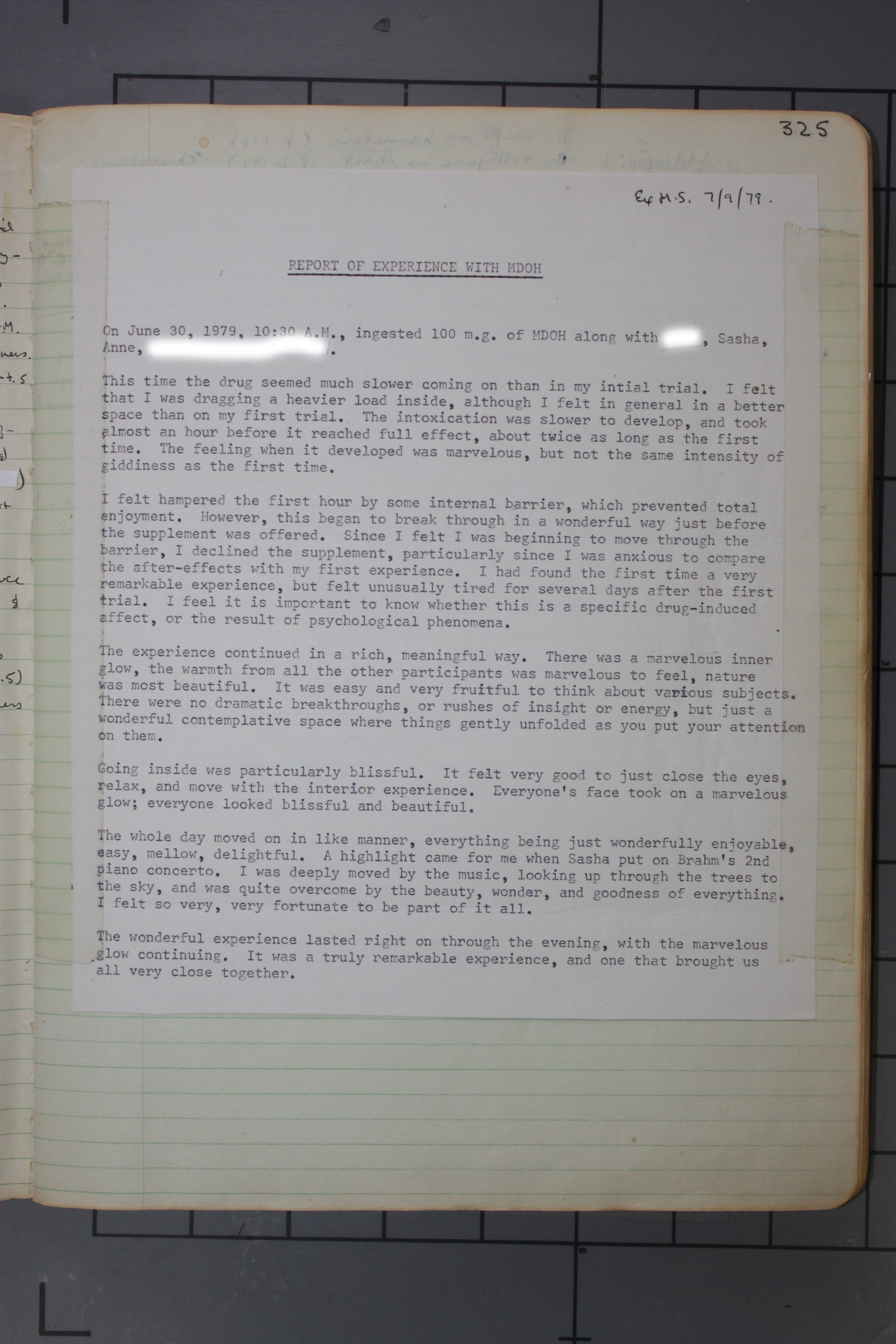 On June 30, 1979, 10:30AM., ingested 100 m.g. of MDOH along with [Redacted], Sasha, Anne, [Redacted].