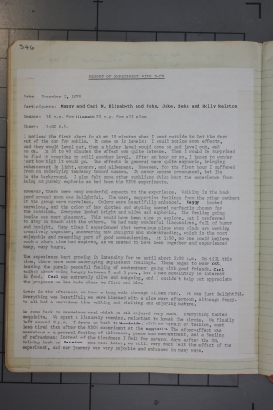 I noticed the first alert in about 15 minutes when I went outside to let the dogs out of the car for awhile. It came on in levels: I would notice some effects, and they would level out, then a higher level would come on and level out, and so on. In 30 to 40 minutes the effect was quite intense. Then I would be surprised to find it mounting to still another level. After an hour or so, I began to wonder just how high it would go. The effects in general were quite euphoric, bringing enhancement in light, energy, and aliveness. However, for the first hour I suffered from an underlying tendency toward nausea. It never became pronounced, but lies in the background. I also felt some other rumblings which kept the experience from being as purely euphoric as had been the MDOH experiments.