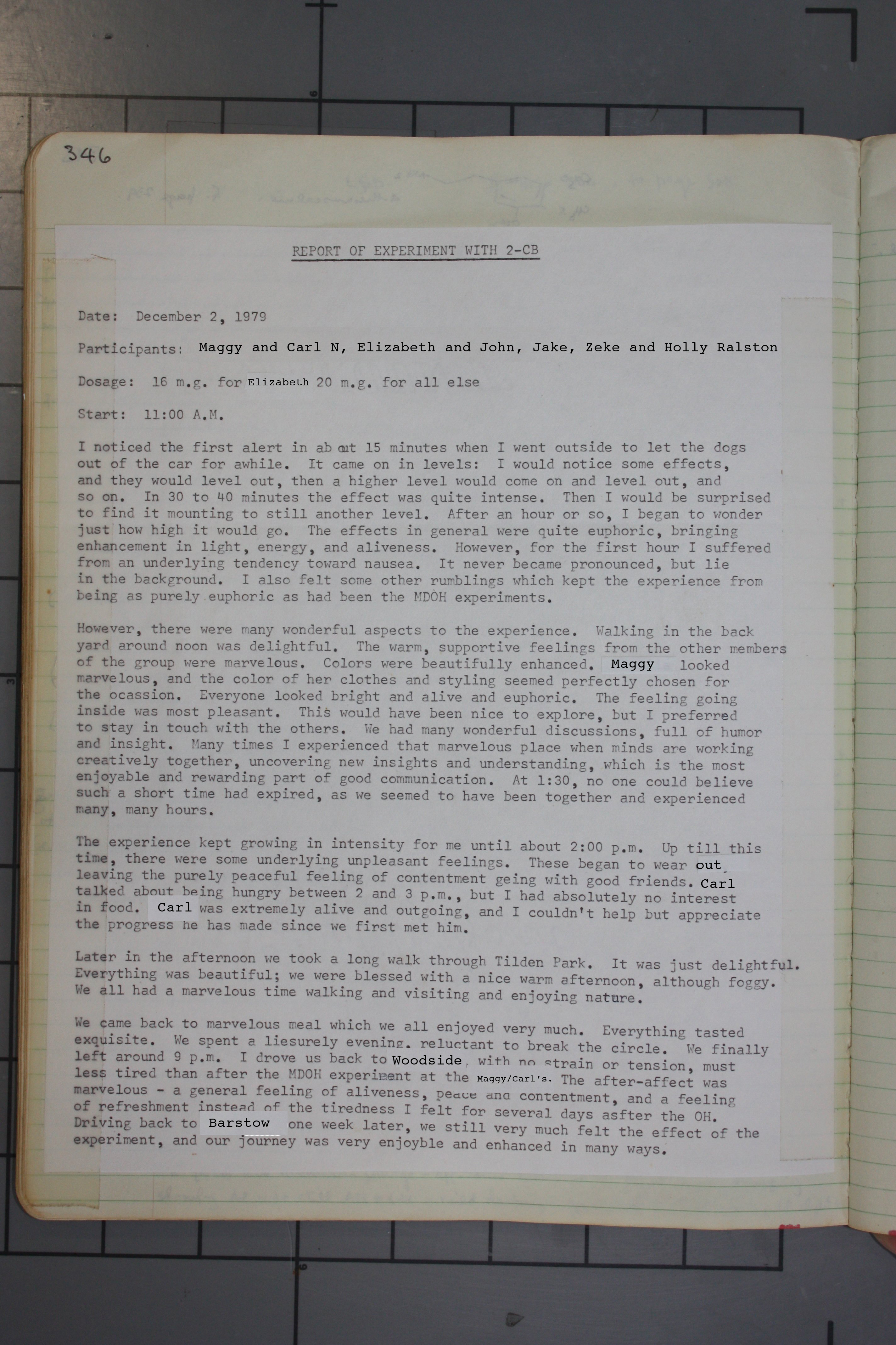 The experience kept growing in intensity for me until about 2:00 p.m. Up till this time, there were some underlying unpleasant feelings. These began to wear off leaving the purely peaceful feeling of contentment going with good friends. Carl talked about being hungry between 2 and 3 p.m., but I had absolutely no interest in food. Carl was extremely alive and outgoing, and I couldn't help but appreciate the progress he has made since we first met him.