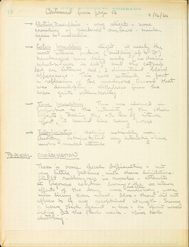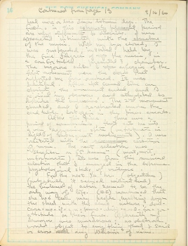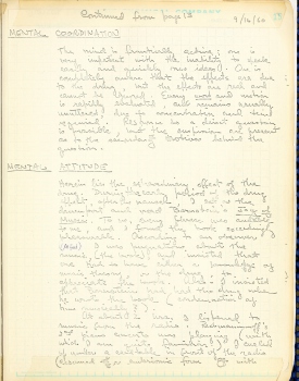 After the intensity of this reaction had subsided, (Gladys) suggested a ride in the car, and my comment was that 'it should be safe, there is a great deal of steel to protect people from me.' We went into the eucalyptus groves behind the Botanical gardens at Cal. It was there that I tried swinging a big stick. (D.E.) I picked up a stone, and mentioned that I could, without hesitation, scratch a gorge in his fender. He inquired why I didn't, and I admitted that I recognized that I would, the next day, have to pay for the damages. It was this reality-awareness that stayed my hand. But I could easily see how another person without this heavily inbred social consciousness, could easily be a vandal. At this point, I had already passed the maximum of the drug, and I could reason in this manner. If I had been confronted with the same situation an hour earlier, I may very well have scraped a nasty gash in his fender.