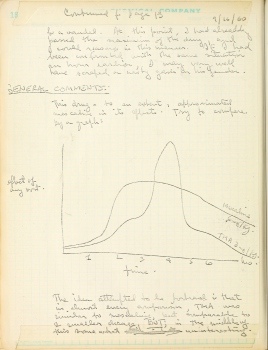 [Erowid Note: Hand drawing of a graph with x and y axes, y axis labeled 'effect of any sort' and x axis labeled 'time' numbered 1 through 6 hours. The curve marked mescaline '6mg/kg' initially goes up higher and comes down more slowly from left to right, where the curve marked TMA 3mg/kg has a higher, sharper peak at 3-5 hours and then drops down to a lower level at 6+ hours than the mescaline line.]