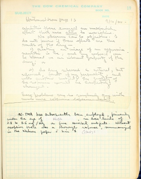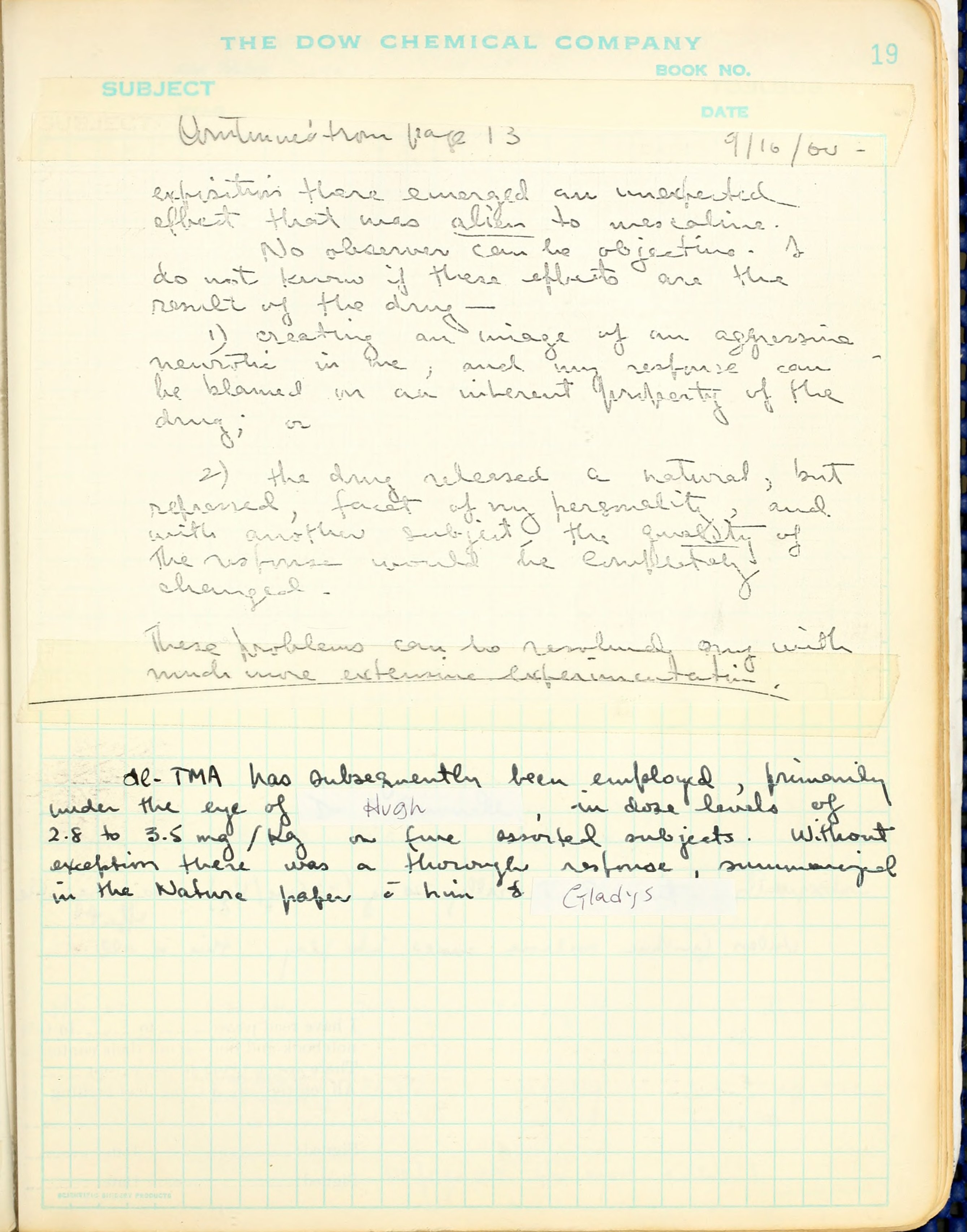 TMA has subsequently been employed, primarily under the eye of Hugh, in dose levels of 2.8 to 3.5 mg/Kg on five? assorted subjects. Without exception there was a thorough response, summarized in the Nature paper [by/with] him & Gladys.