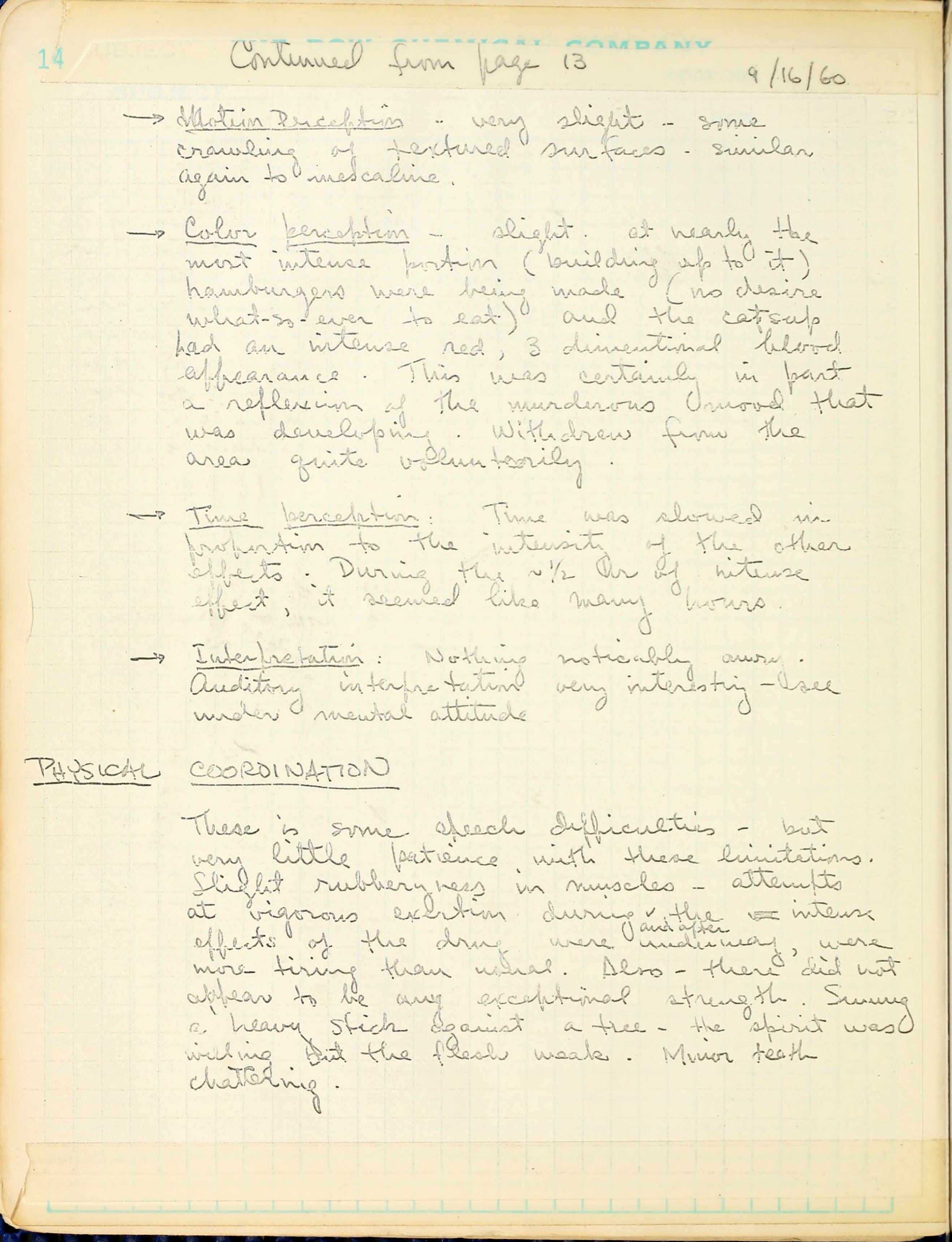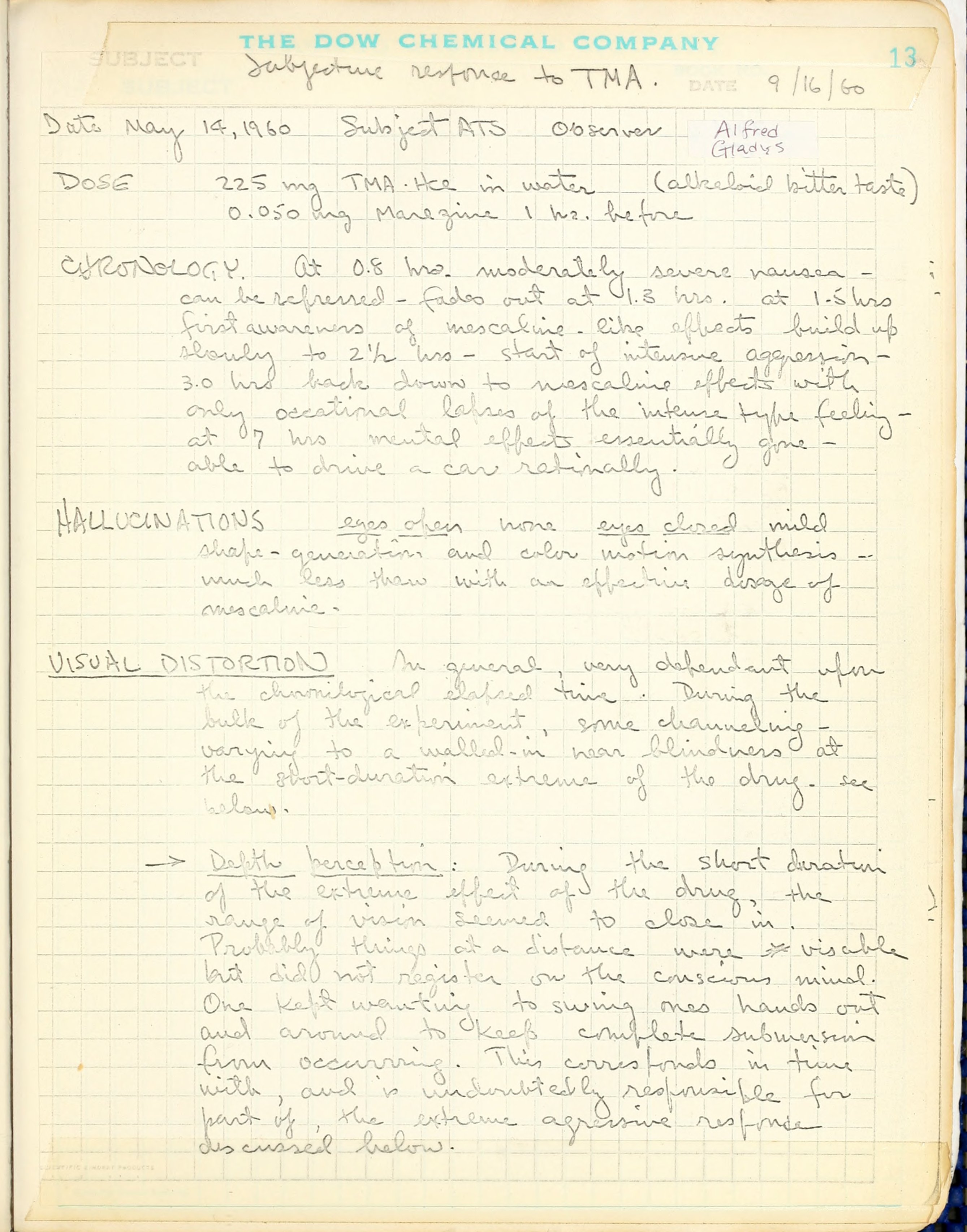 Depth Perception: During the short duration of the extreme effect of the drug, the range of vision seemed to close in. Probably things at a distance were visible but did not register on the conscious mind. One kept wanting to swing ones hands out and around to keep complete submersion from occurring. This corresponds in time with, and is undoubtedly responsible for part of, the extreme aggressive response discussed below.