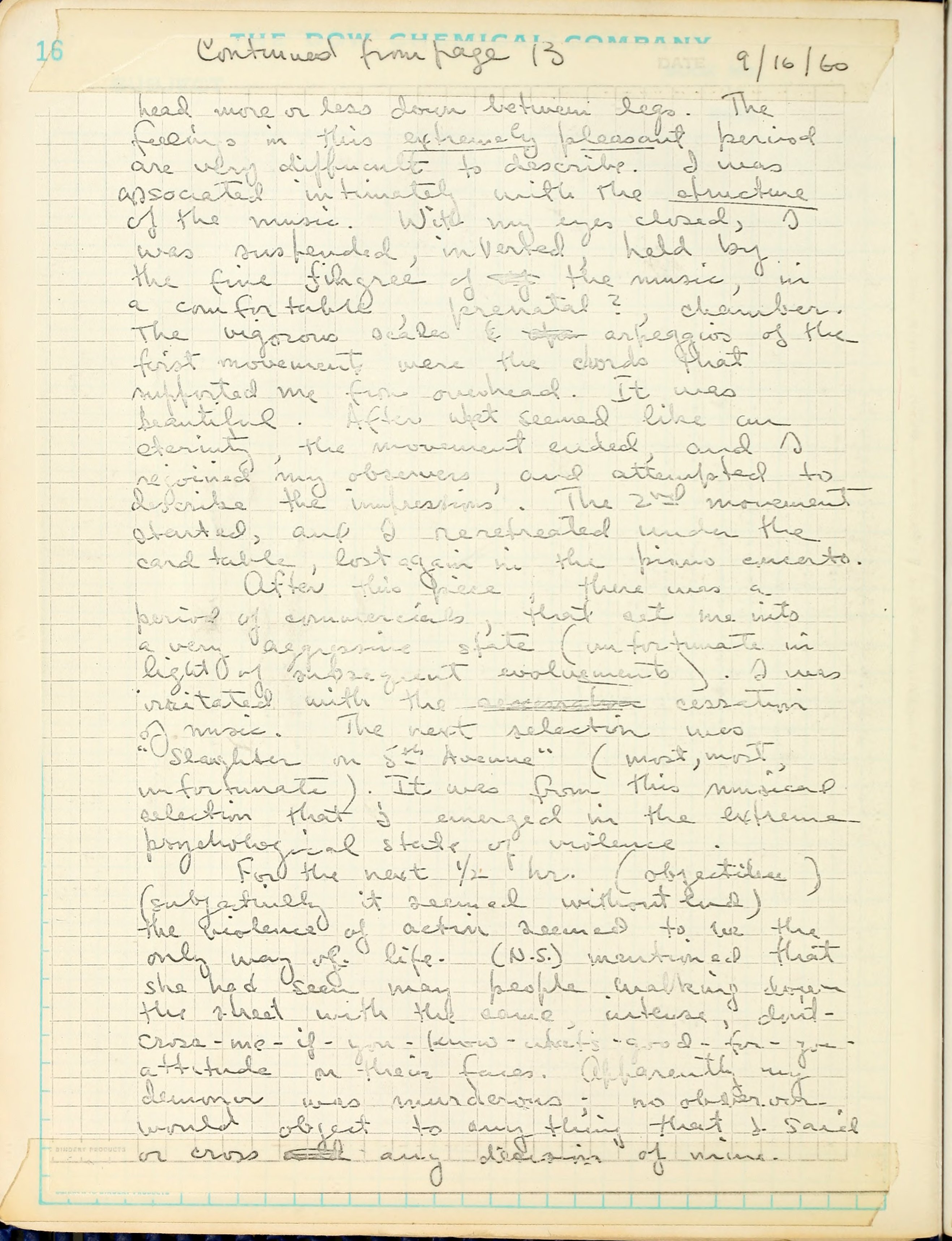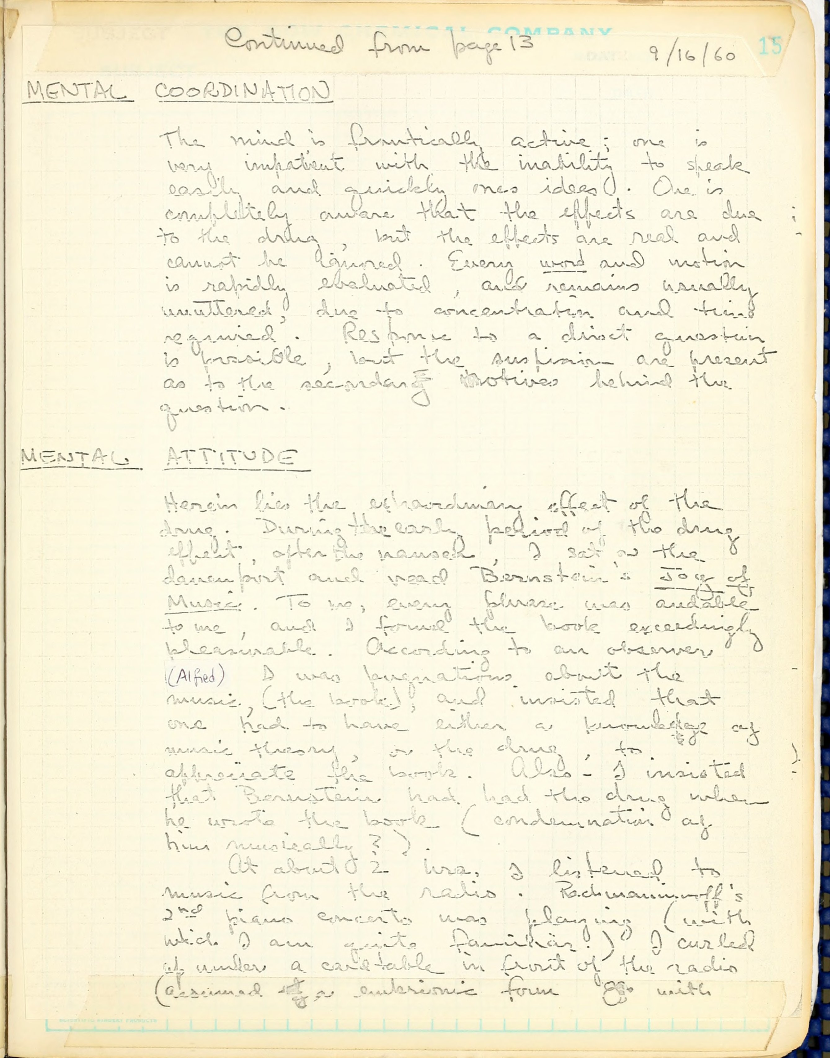 At about 2 hrs. I listened to music from the radio. Rachmaninoff's 2nd piano concerto was playing (with which I am quite familiar) I curled up under a card table in front of the radio (assumed a embryonic form with head more or less down between legs. The feelings in this extremely pleasant period are very difficult to describe. I was associated intimately with the structure of the music. With my eyes closed, I was suspended, inverted, held by the fine filigree of the music, in a comfortable, prenatal?, chamber. The vigorous scales & arpeggios of the first movement were the chords that supported me from overhead. It was beautiful. After what seemed like an eternity, the movement ended, and I rejoined my observers, and attempted to describe the impressions. The 2nd movement started, and I re-retreated under the card table, lost again in the piano concerto.