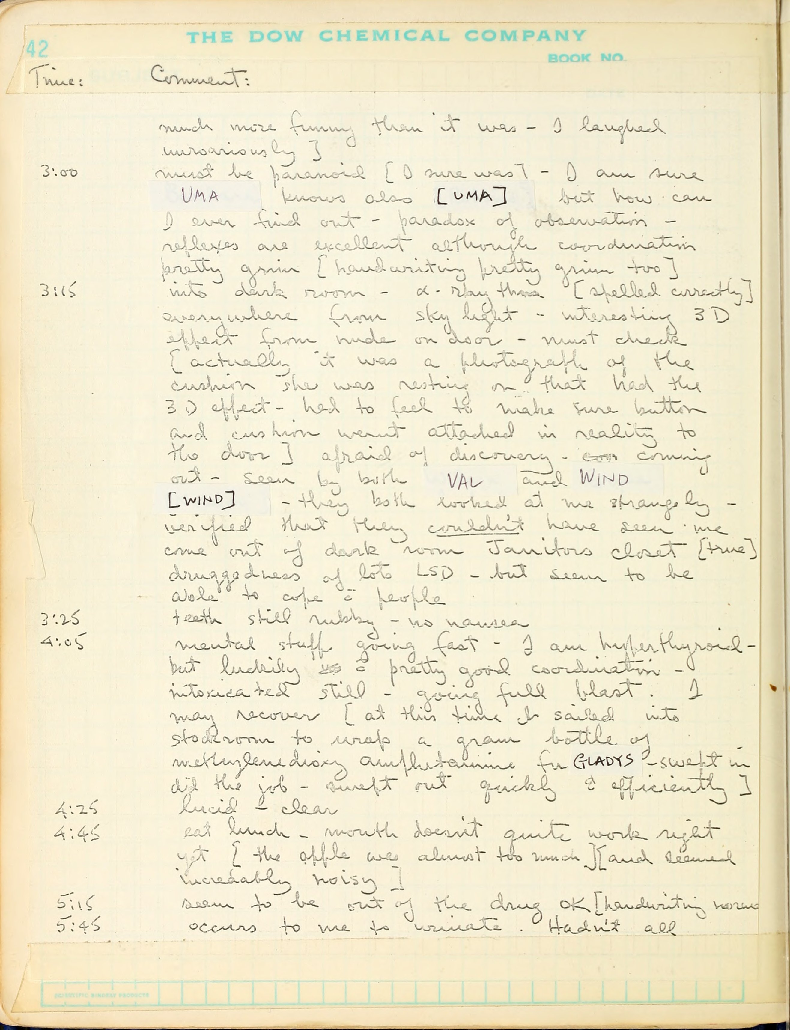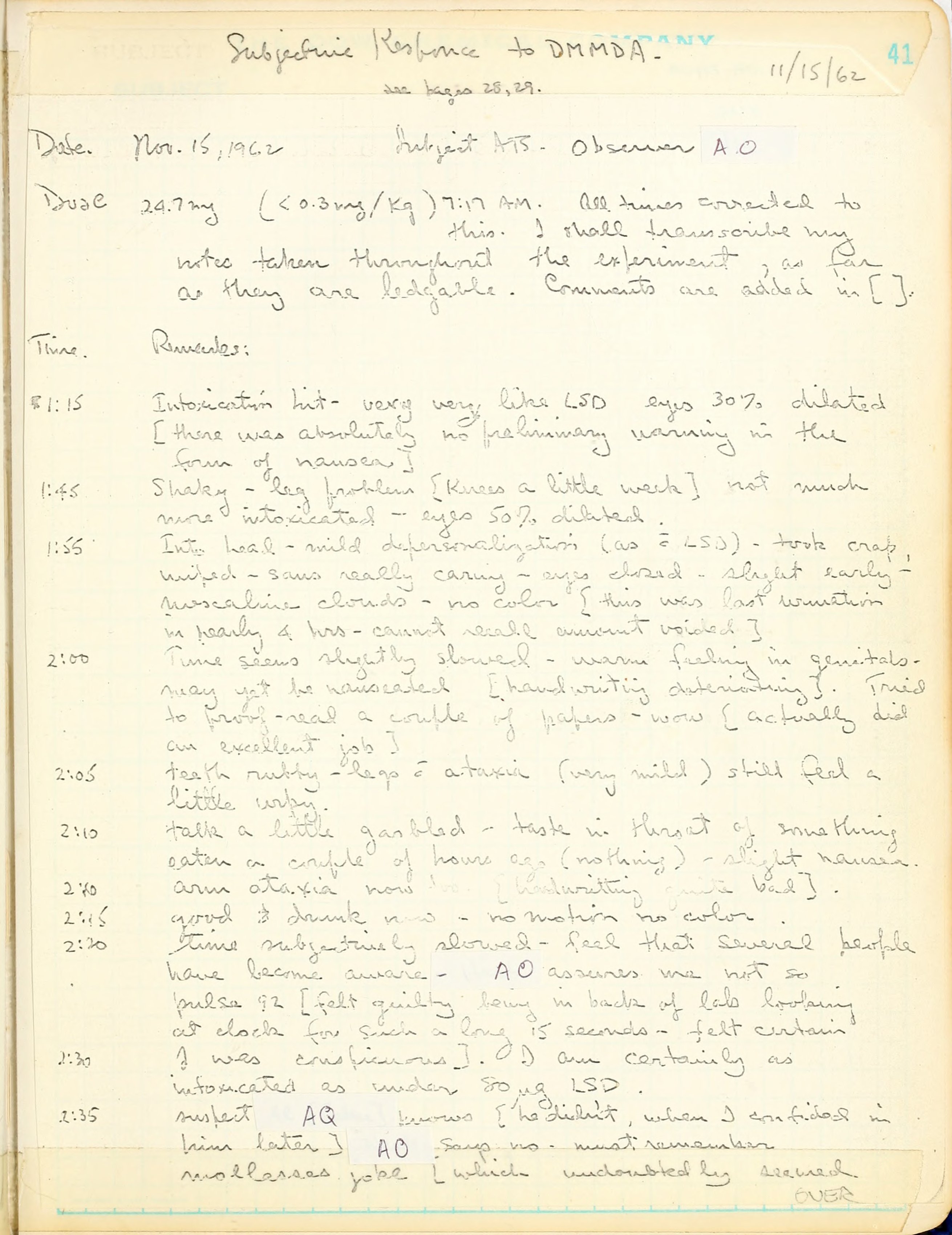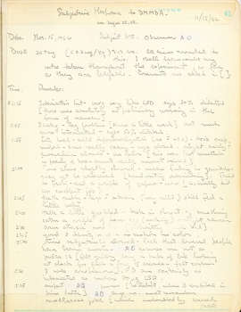 2:00 Time seems slightly slowed - warm feeling in genitals - may yet be nauseated [handwriting deteriorating]. Tried to proof-read a couple of papers - wow [actually did an excellent job]