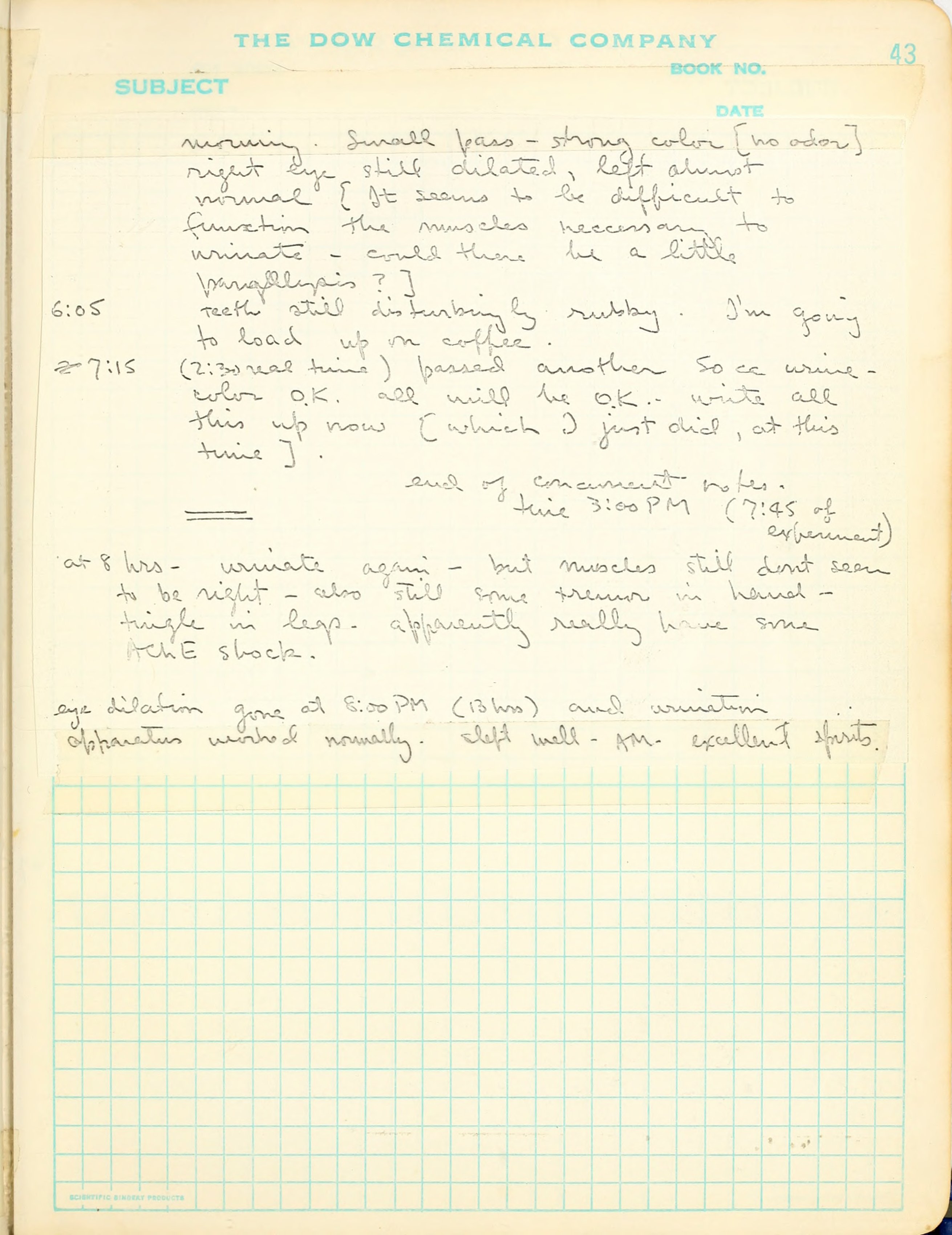 5:45 occurs to me to urinate. Hadn't all morning. Small pass - strong color [no odor] right eye still dilated, left almost normal [It seems to be difficult to function the muscles necessary to urinate - could there be a little paralysis?]
