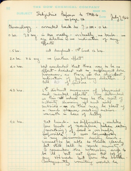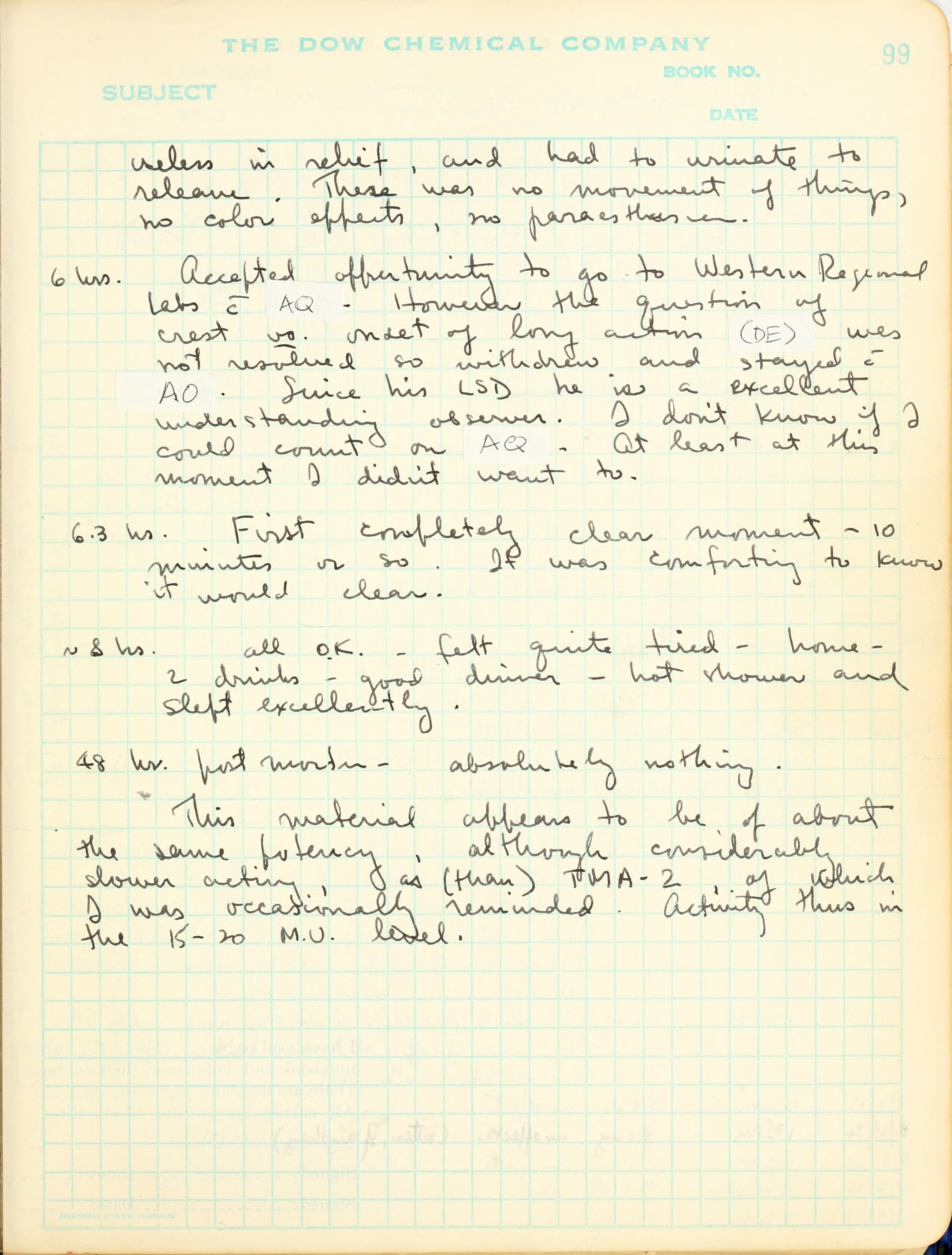 6.0 hrs. Accepted opportunity to go to Western Regional Labs with AQ. However the question of crest or onset of long action (DE) was not resolved so withdrew and stayed with AO. Since his LSD he is a excellent understanding observer. I don't know if I could count on AQ. At least at this moment I didn't want to.