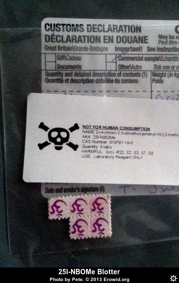25I-NBOMe was the big surprise. One person was openly selling professional-looking printed and perforated blotter squares that he claimed contained 1,000 micrograms of 25I-NBOMe each, which he explained was a sufficiently strong dose. He was peddling this drug as openly as people were smoking marijuana; that is, he didn't have a sign advertising the product and he wasn't barking about it; but after Day 1 it seemed to simply be known: he was the guy selling 25I-NBOMe. When asked about the substance, he identified it as being, "Like 2C-I, but legal." As far as he was concerned, it was perfectly legal for him to sell the 25I-NBOMe blotter as long as he didn't explain how to use it as a drug (which, after very little discussion, he did do--specifically pointing out that the blotter should be kept in the top of the mouth between the lip and gums for 10-15 minutes and one should minimize swallowing saliva for that time). Of course, it was forbidden to sell anything in the campground without permission from the organizers, so he was at risk for being tossed out at the very least.The 25I-NBOMe salesman's hubris blew my mind. Even assuming law enforcement believed he wasn't selling his blotter paper for drug use, this was at a psychedelic music festival and he was selling individual pieces of blotter. If nothing else, that would be sufficient to ruin one's weekend via arrest on suspicion of selling LSD.