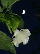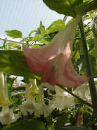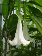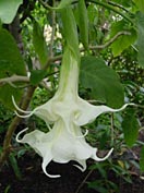 This hybrid was produced by Rich Sanders at the University of Connecticut EEB Greenhouse. It has intermediate characteristics between the brugmansia shown above (the mother plant) and B. versicolor 'apricot peach' (pollen source). White is the dominant color for hybrids when crossing these species of brugs.