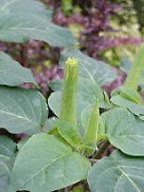 Plants are herbaceous. May become somewhat woody. Calyx points above the horizontal upon emergence of the corolla*, and flowers are generally erect. Genus Datura