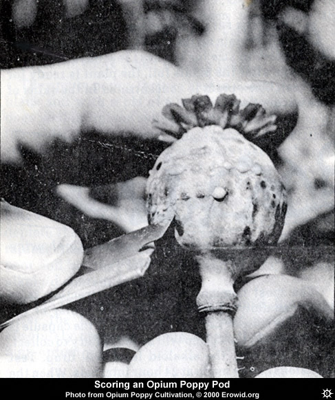 Immediately after cutting, milky liquid opium will form droplets around the incision. It will coagulate slowly from contact with the air, thickening and turning brown at the same time. Generally, this liquid opium is allowed to dry for ten or twelve hours before it is scraped from the pod. If you can't wait, go ahead and lick some directly off the capsules. Don't get carried away though, or you may end up face down in your field.